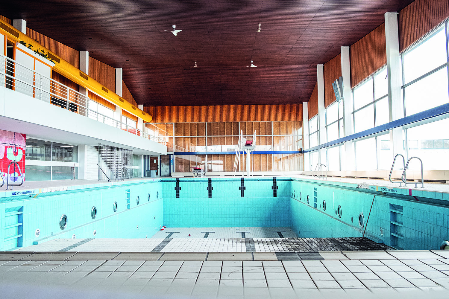 Bei diesem Anblick wird der eine oder die andere sicher nostalgisch. Wie viele junge Kempenerinnen und Kempener haben in diesen Becken schwimmen gelernt? Wie viele haben sich in diesen Umkleidekabinen für das Schulschwimmen fertig gemacht? Wie viele haben hier versucht, Gleichaltrigen mit einer gekonnten Arschbombe vom Drei-Meter-Brett oder einer stilvollen Performance auf der gelben Röhrenrutsche zu imponieren?