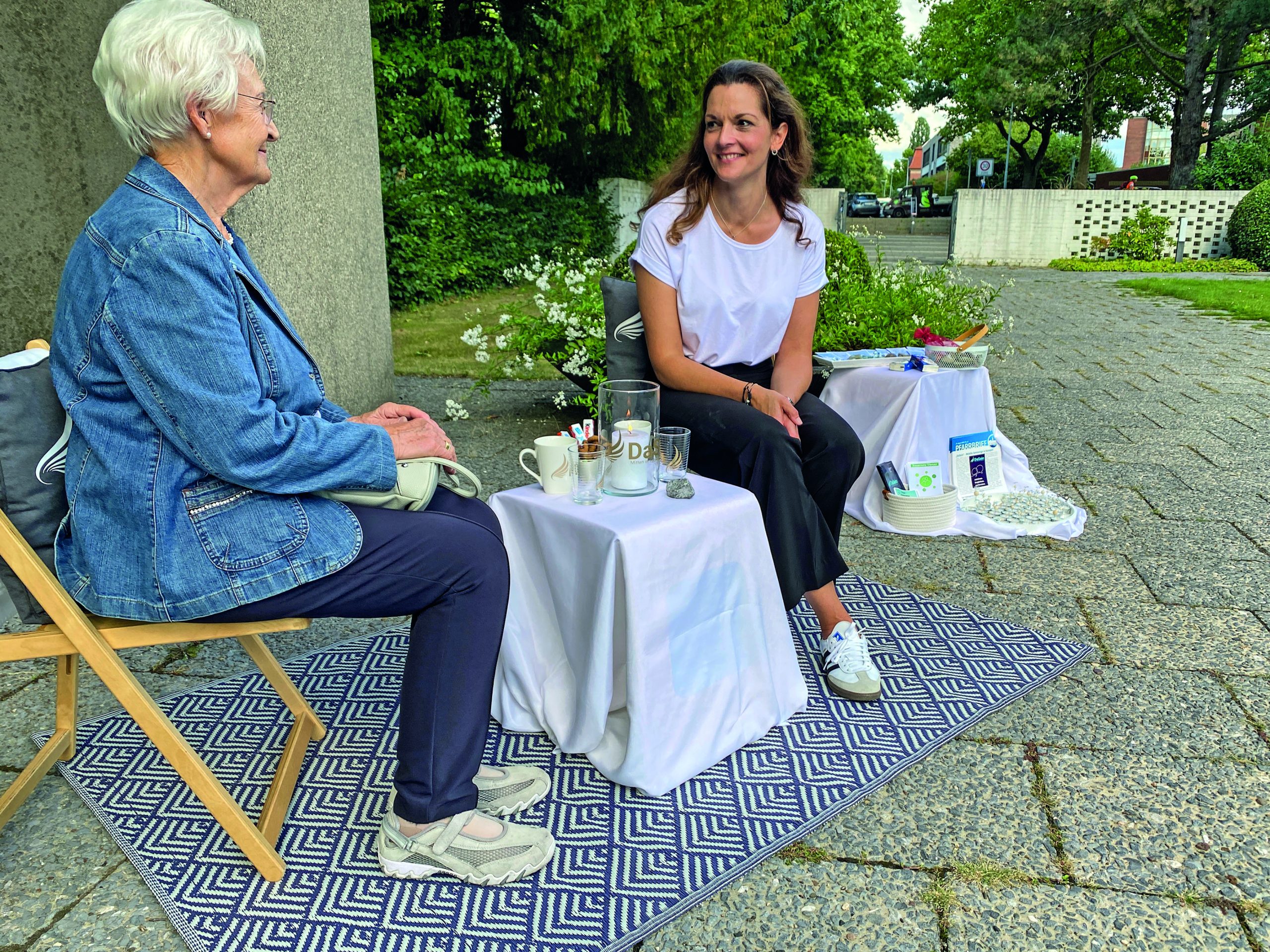 Der Rahmen ist bewusst niederschwellig: Ein Teppich markiert einen kleinen eigenen Raum. Es gibt zwei Stühle für die Begegnung auf Augenhöhe. Kissen und eine Decke sorgen für Behaglichkeit. Eine brennende Kerze steht für Licht, Wärme und Hoffnung. Ein Tasse Tee oder ein Glas Wasser können stärken. Und manchmal ist auch ein Taschentuch oder ein Stückchen Schokolade hilfreich. Nadine Mihm hat kleine Mitgebsel vorbereitet. Impulskarten bieten kurze Gedanken, die Mut machen und Trost spenden. Zudem gibt es Infomaterialien über Anlaufstellen, an denen man sich über das DaSein-Angebot hinaus Unterstützung holen kann.