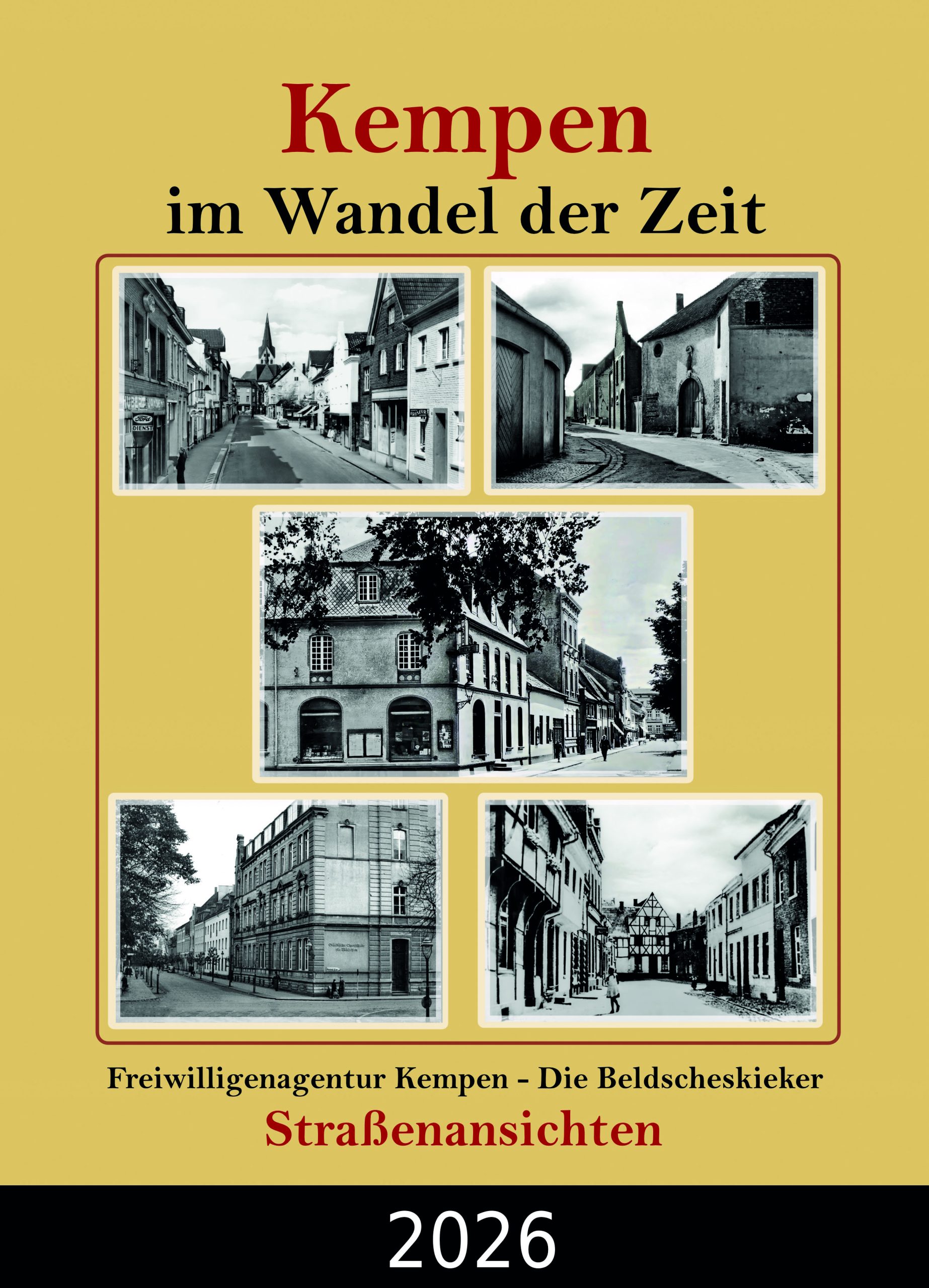 Vergangenheit trifft auf Gegenwart im neuen Kalender „Kempen im Wandel der Zeit“ der Beldscheskieker für das kommende Jahr 2026. Wer sich ein wenig Nostalgie ins Zuhause holen möchte, kann den Kalender bei der Freiwilligenagentur im Rathaus erwerben oder bei erlebe Kempen gewinnen. Wir verlosen zweimal ein Exemplar. Teilnahme ab 18. Der Teilnahmeschluss ist der 16 November.